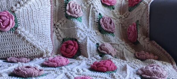 Está tejida a partir de grannys, que se unen para formar una trama pareja y envolvente, sobre la que florecen rosas en relieve, protagonistas suaves pero presentes.